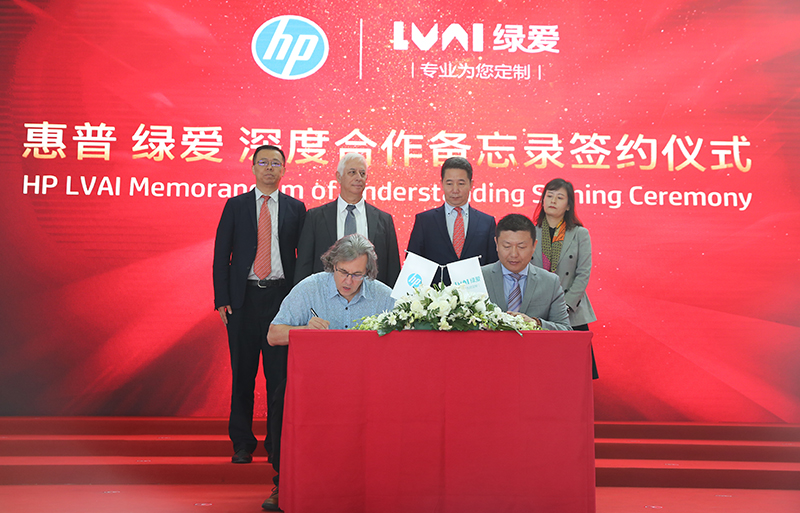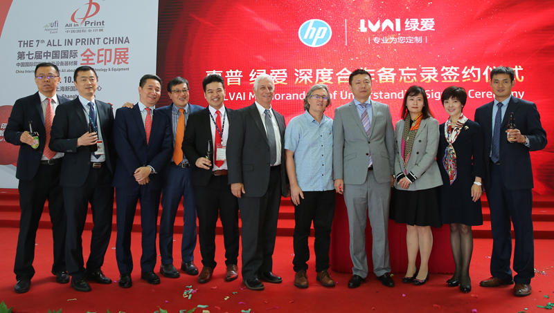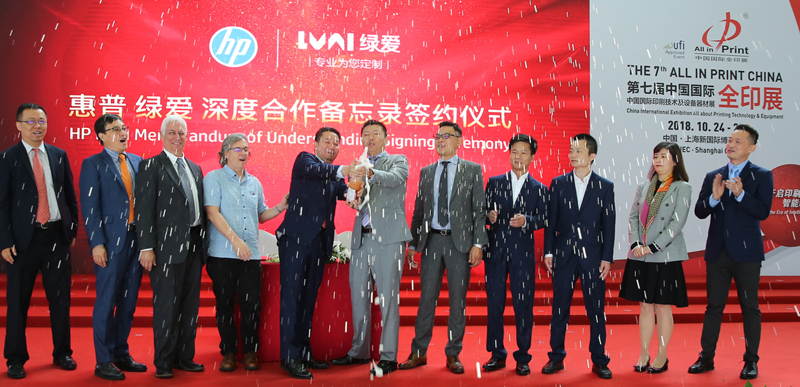 簽約儀式在上海新國際博覽中心2018中國國際全印展現場舉行,綠愛股份董事長郭建波先生、技術學院顧問Simon Wang;綠愛股份董事,運營總監王學龍先生;綠愛股份董事,新業務總監孫士鑫先生;綠愛股份監事,市場總監方桂林先生。惠普公司Indigo數字印刷業務部副總裁兼總經理Alon Bar-Shany先生、惠普Indigo數字印刷事業部中國區總經理李鵬先生出席現場。