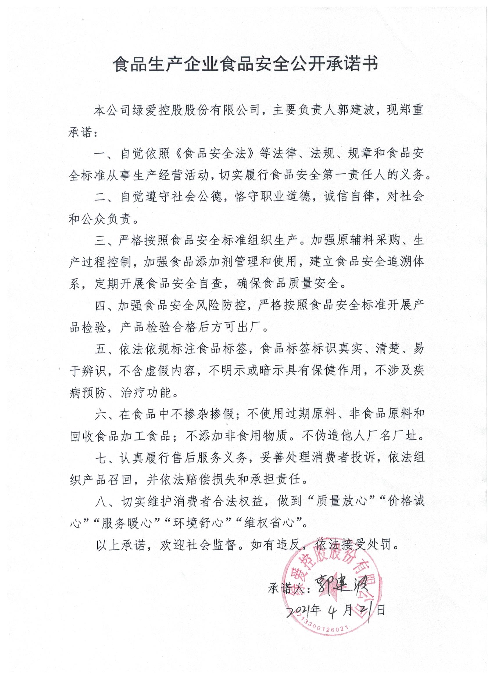 為保證食品安全,保障消費者身體健康和生命安全,遵照《食品安全法》等法律法規的相關規定,我公司作以下承諾: